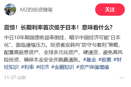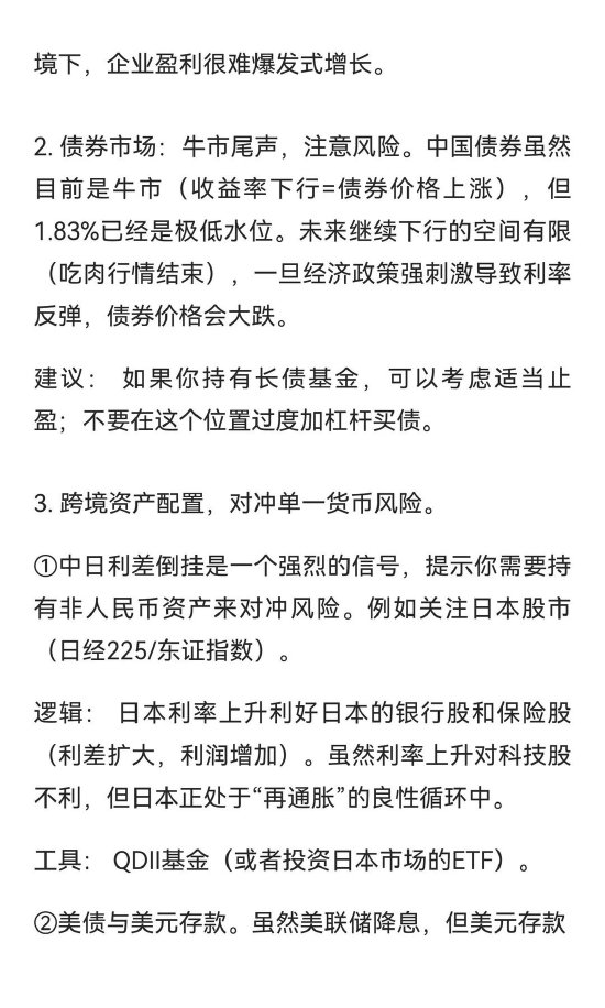 中日10年期国债收益率倒挂,暗示中国经济可能“日本化”,面临通缩压力。投资者应转向“防守与套利”策略,配置高股息资产、全球多元化资产、硬通货,避免高风险投资,确保本金安全并跑赢通胀。